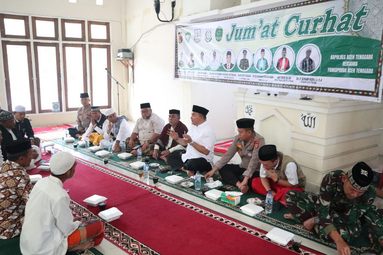 Kutacane – Dalam upaya mempererat sinergi antara aparat dan masyarakat, Kapolres Aceh Tenggara AKBP Yulhendri, S.I.K bersama unsur Forum Komunikasi Pimpinan Daerah (Forkopimda) menggelar kegiatan Jumat Curhat di Masjid Jami’ Al-Ikhlas, Desa Penungkunen, Kecamatan Ketambe, Kabupaten Aceh Tenggara, Jumat (26/9/2025).